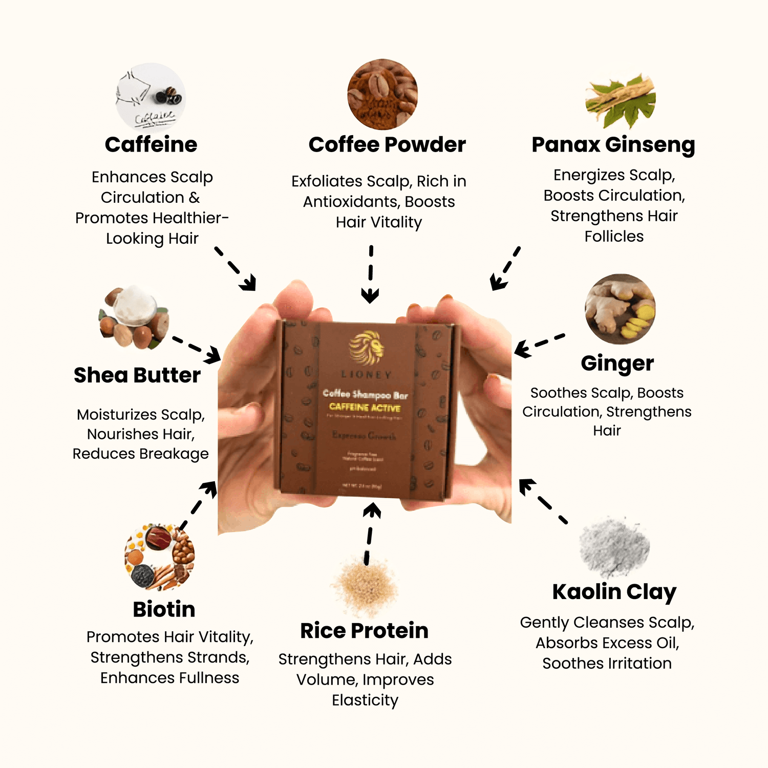 At LIONEY, we set out with a simple mission: to harness the natural power of coffee and bring it into your hair care routine in a more effective and convenient way than ever before. For years, millions have trusted coffee to support stronger, fuller-looking hair and improve scalp health. We wanted to take this tradition further, so we developed the LIONEY Coffee Shampoo Bar—a breakthrough 3-in-1 formula that cleanses, exfoliates, and supports hair vitality all in one.